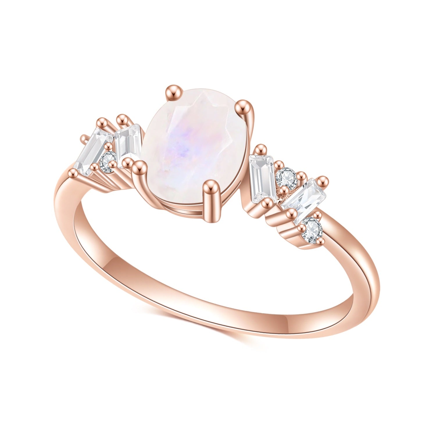 This stylish Oval Shape Natural Moonstone Silver Ring features a stunning oval natural moonstone in center. decorated with small baguette cut and round cut zircon on the ring arm for a subtle touch of sparkle. Perfect for everyday wear. this beautiful ring is sure to make a statement.