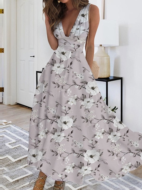 Fashion Deep V-neck Sleeveless Sexy Elastic Waist Dress High Waist Large Swing Satin Party Dress Women Evening Dress Elegant