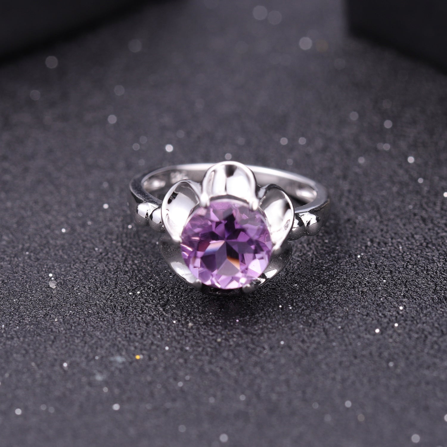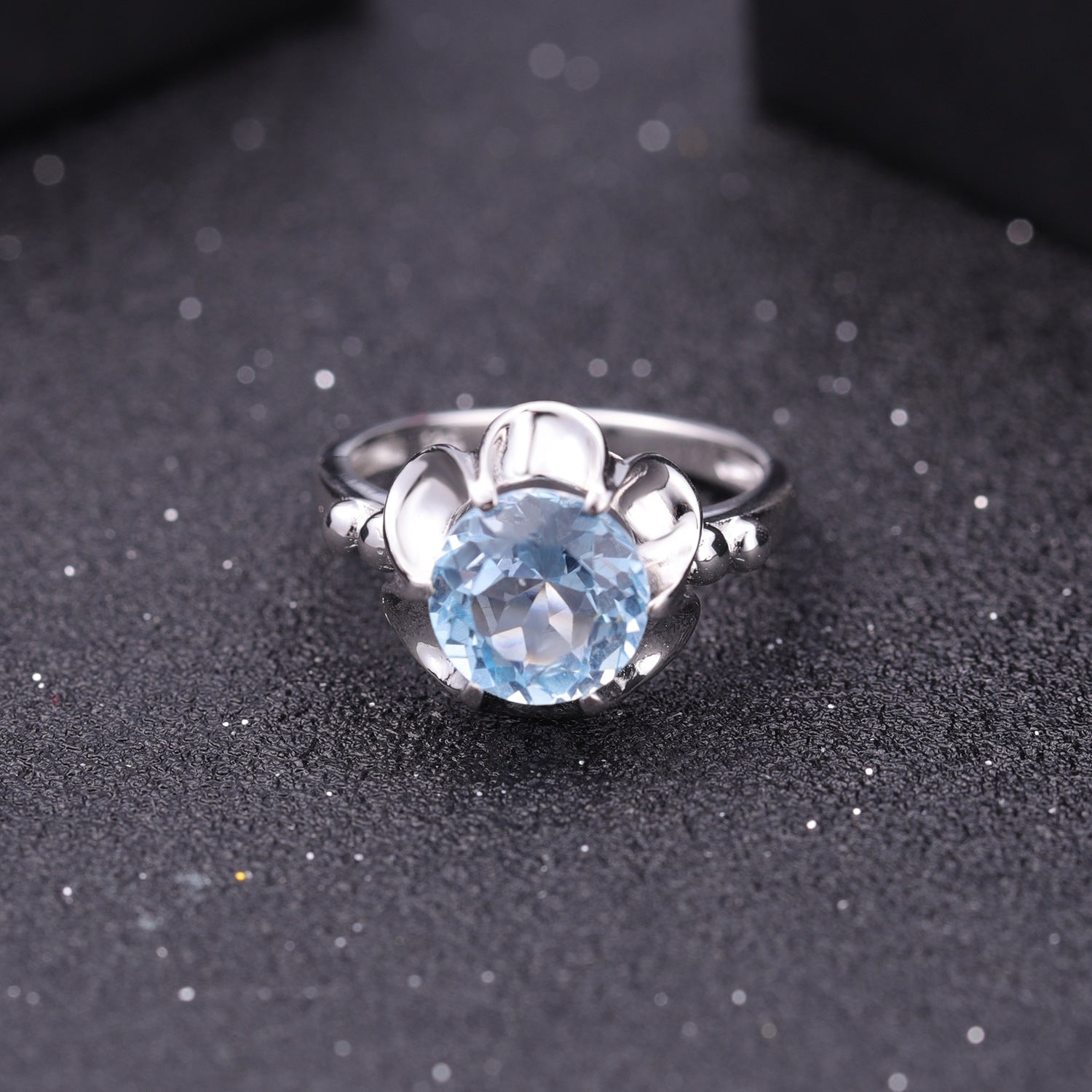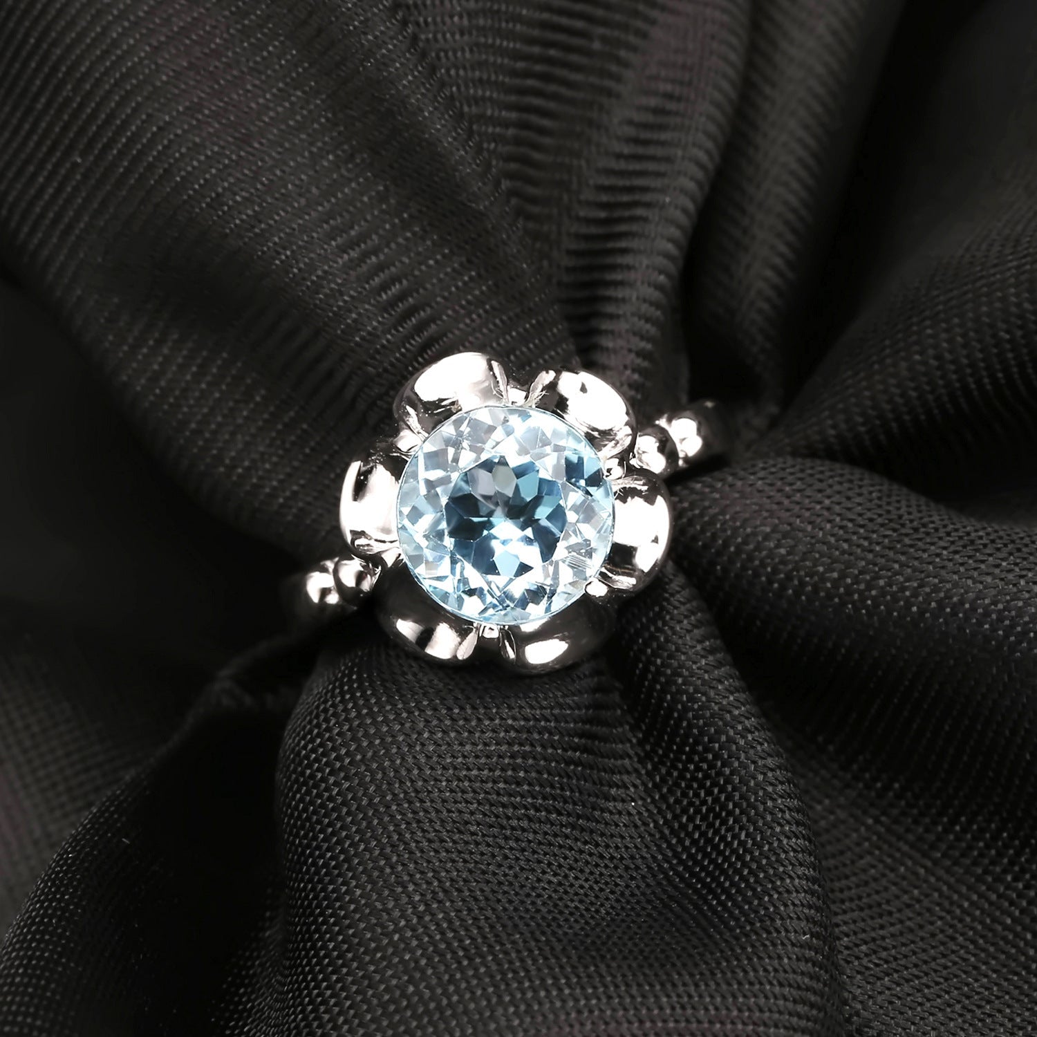 This beautiful ring is crafted with a round cut gemstone and beautiful flower shape prongs. creating an eye-catching design that is sure to impress. The high-quality sterling silver shines brightly and adds a luxurious touch. Perfect for any occasion.