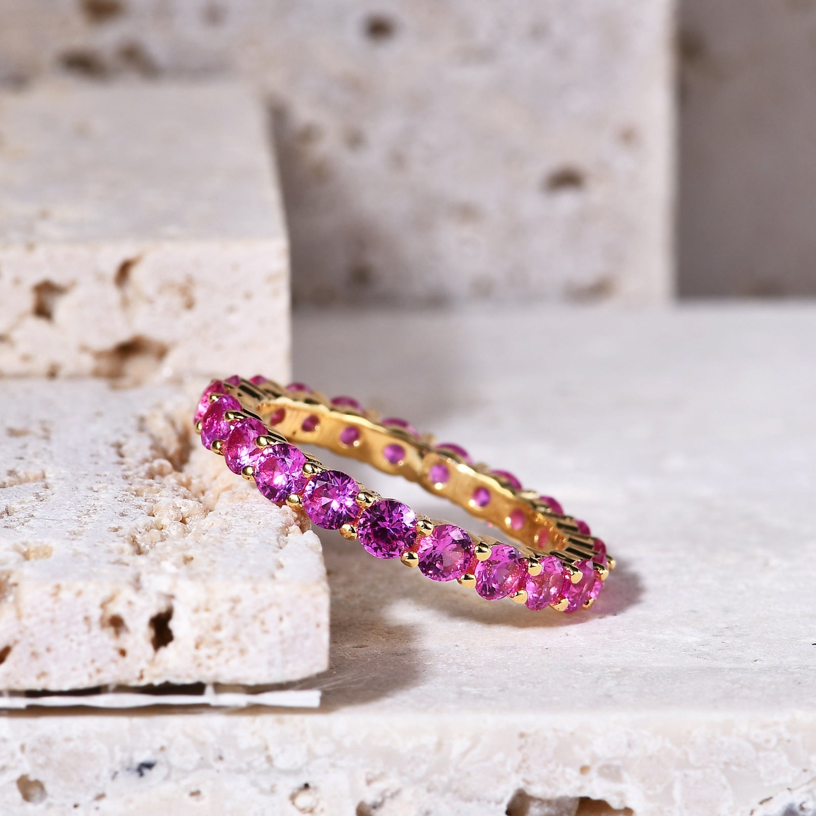 This exquisite ring is crafted with a full circle of Red Corundum. Crafted in Sterling Silver plated in luxurious gold colour. Its exceptional beauty combines both simplicity and elegance. making it the perfect accessory for any occasion.