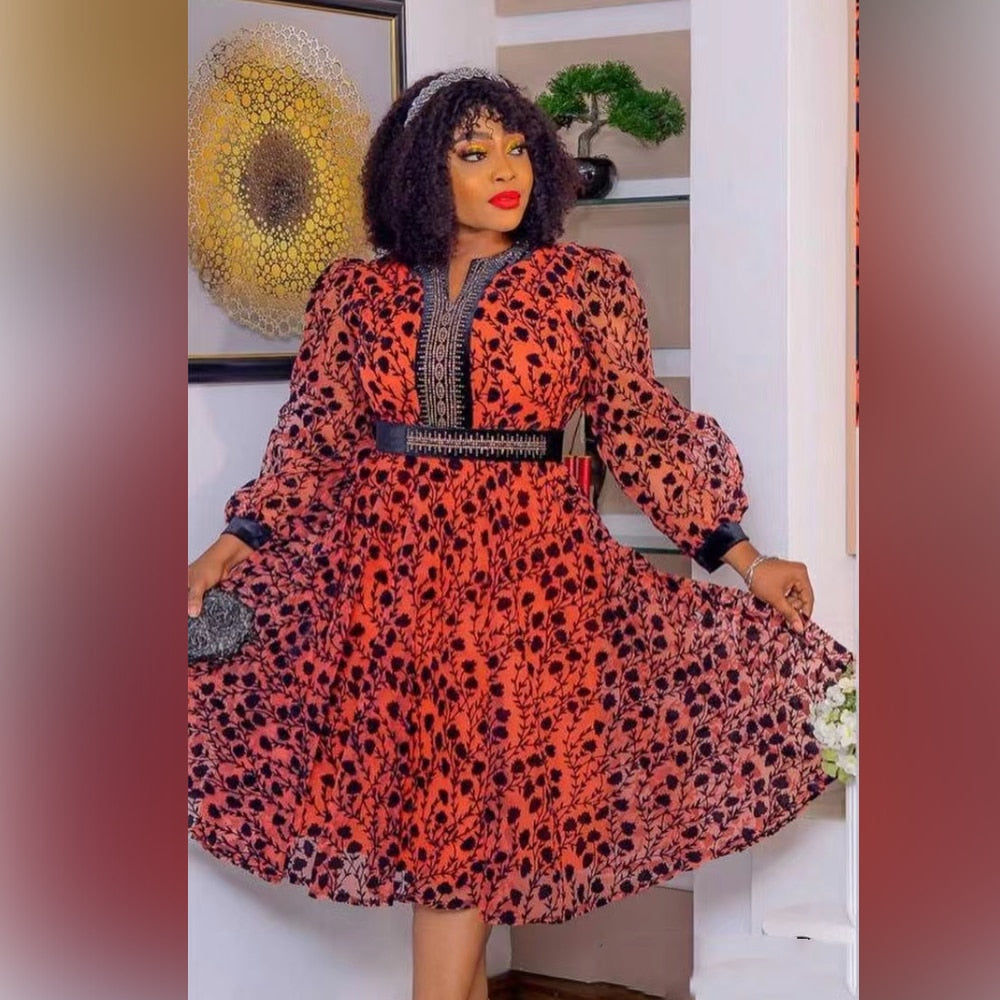 Floral Print Dresses Women Long Sleeve Elegant A-line Dress With Belt Fashion Evening Party Dresses Africa Female 2023 Summer