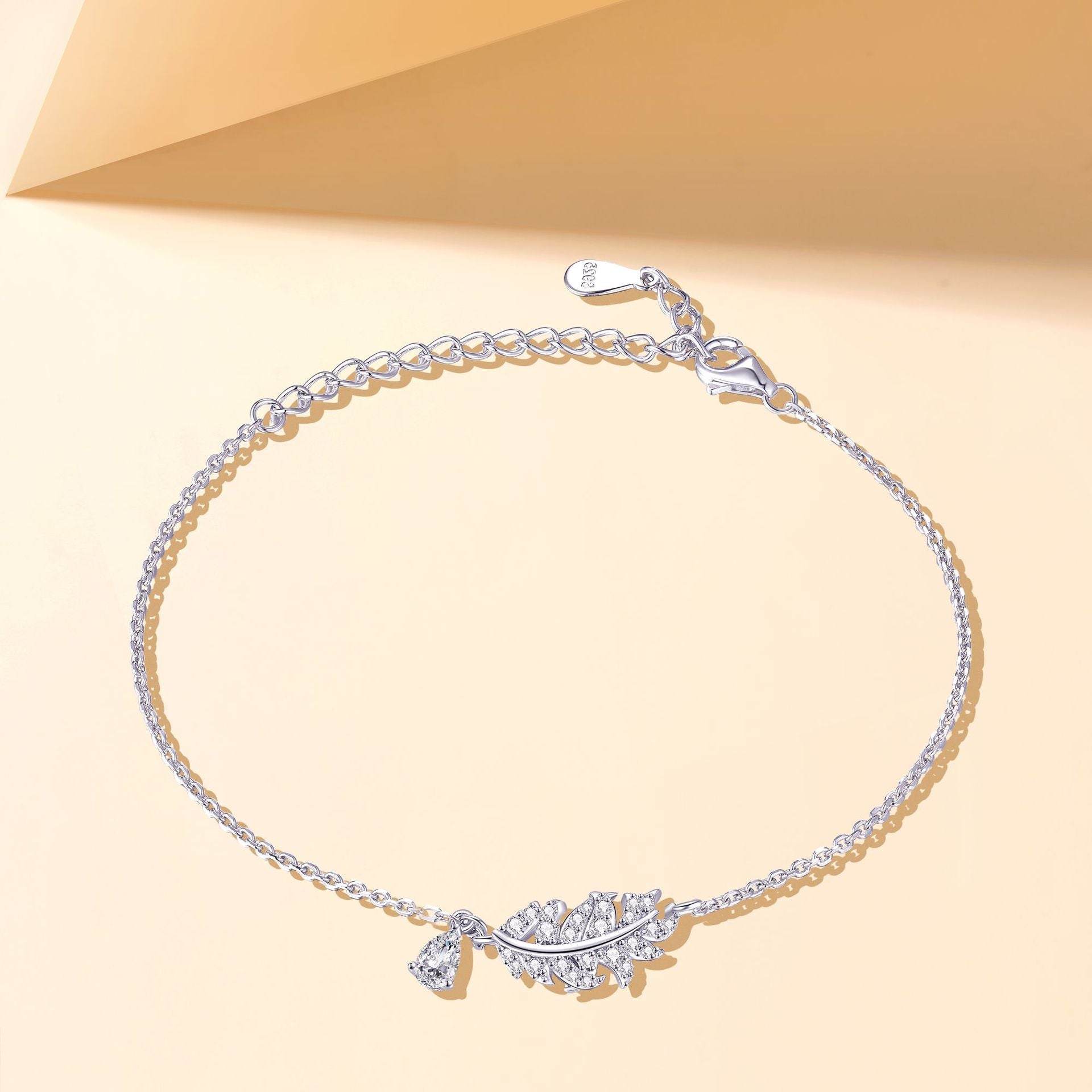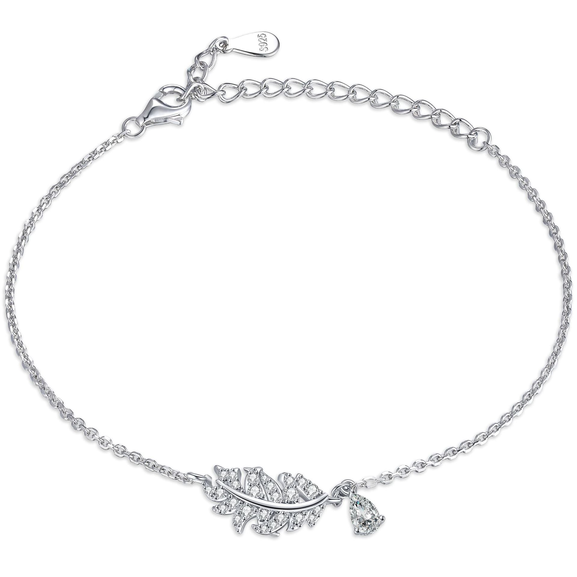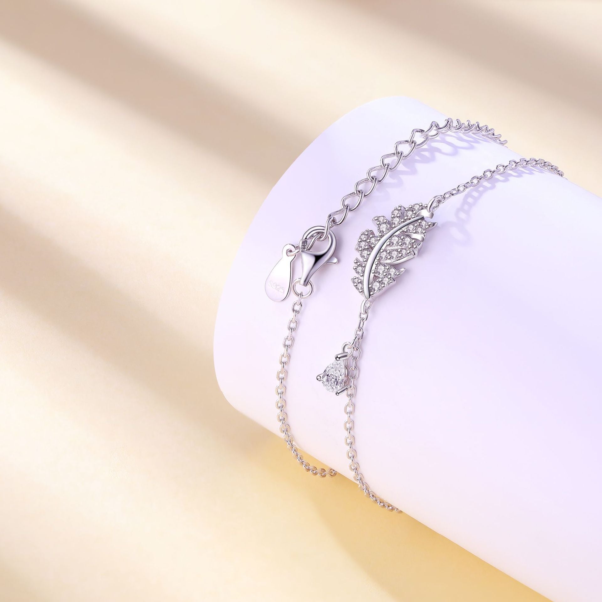 Adorn your wrist with this sleek and sophisticated bracelet featuring a gleaming silver chain and a dangling pear-shaped zircon feather charm. Crafted with attention to detail and quality materials. this beautiful piece is perfect for adding a touch of elegance to any look.