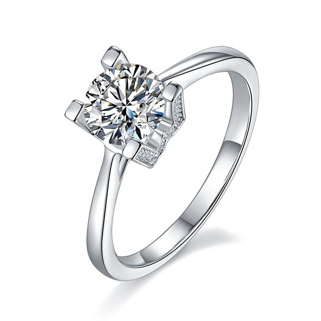 This charming and dainty ring is designed for women who appreciate the beauty of a delicate and colourful jewelry piece. It features a 1.0-carat Moissanite stone. and the cutting and polishing technology of the stone makes it emit dazzling light. Multiple small Moissanite stones are inlaid on the ring. making the entire ring more sparkly.