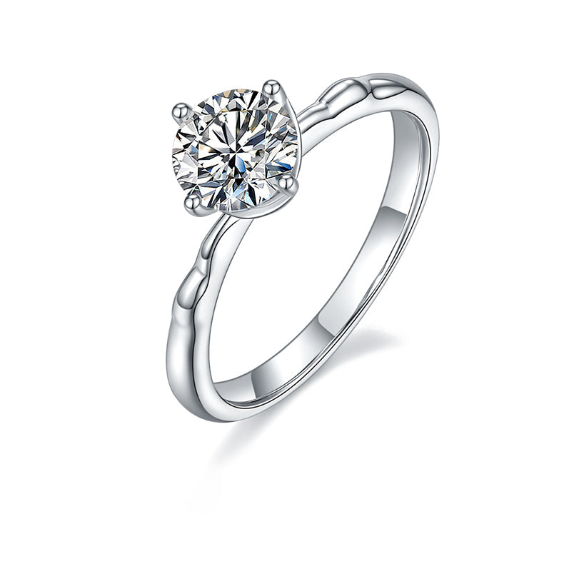 This ring features a 1.0-carat round cut Moissanite stone. The four-prongs design make the stone more prominent. The unique wave ring band is the characteristics of this ring. making the entire ring more fashion .