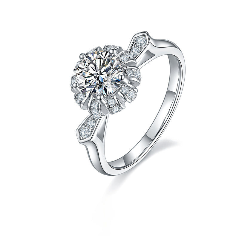 This sophisticated Moissanite ring showcases a shiny 1-carat round cut Moissanite stone. prized for its brilliance and draw attention to its stunning beauty. The unique five prongs design with small Moissanite is the characteristics of this ring. making it more gorgeous and fashion.