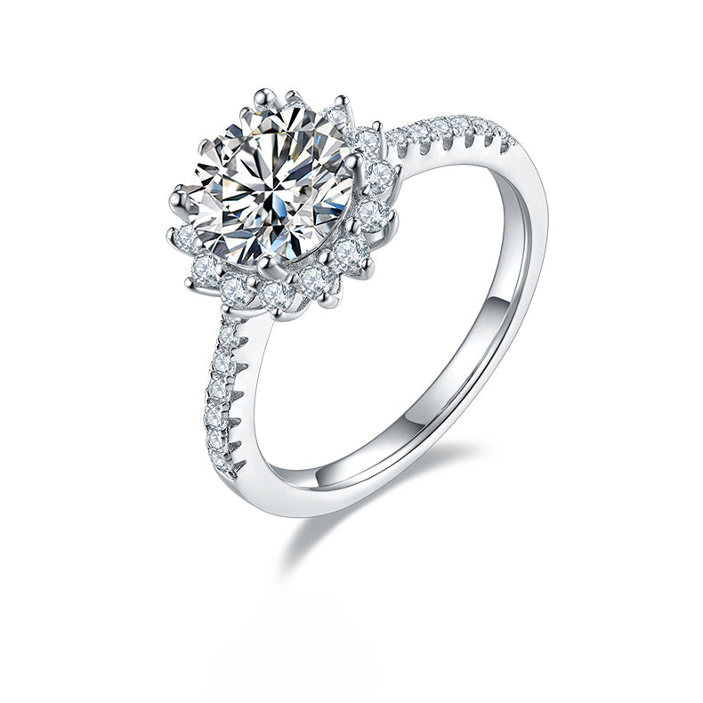 This ring uses a round cut 2.0-carat Moissanite . with high colour and purity. sparkly in any occasion. The unique lotous petal prongs design with small Moissanite is the characteristics of this ring. making it more gorgeous and elegance.
