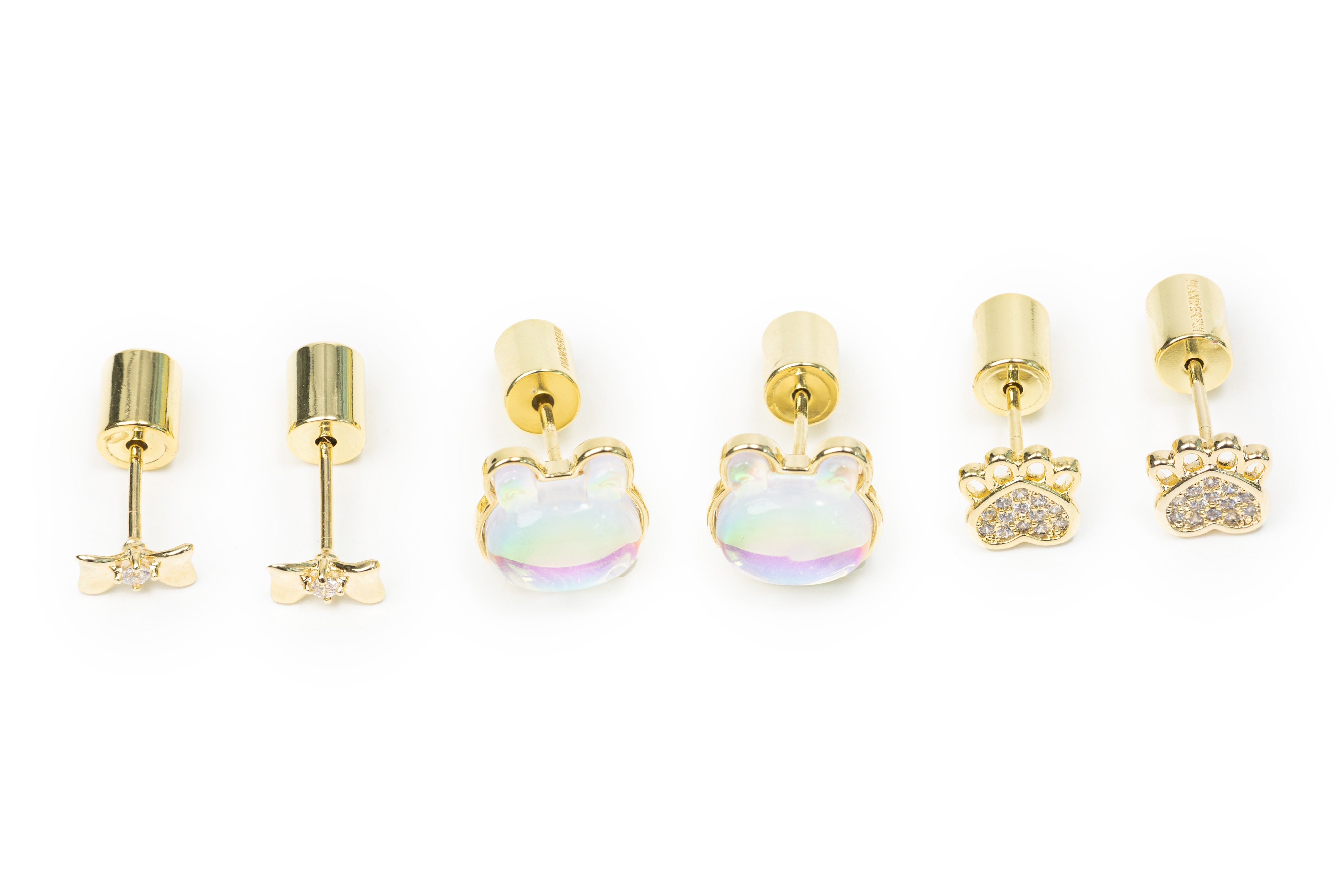 Brighten your look with this fashionable pack of Nap golden earrings. Choose between three different designs: bear. claw. and bowknot. Add a touch of sophistication and playful to any outfit with this lovely accessory pack.