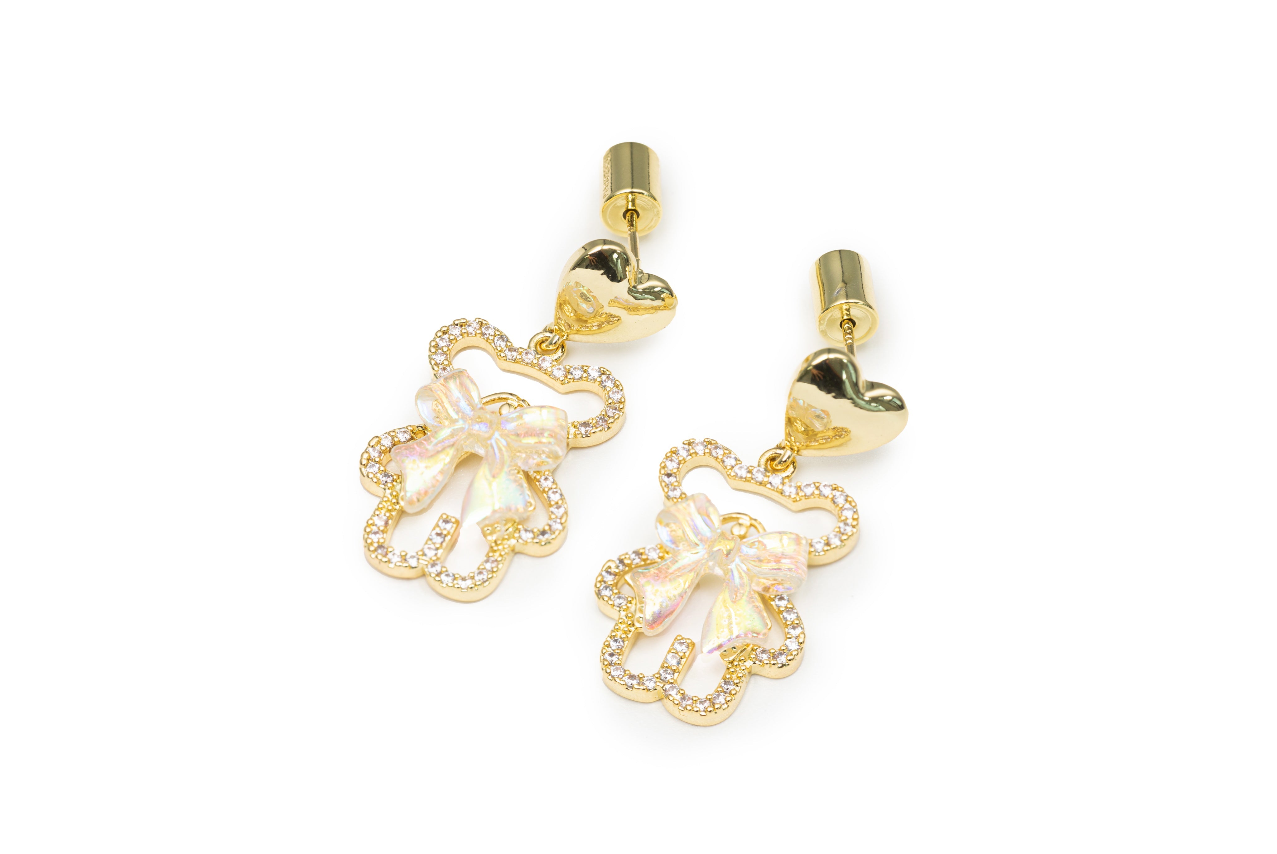 This charming Golden Bear with Bows Drop Earrings make a beautiful addition to any outfit. The lovely litter bear feature a beautiful bowknots and is perfect for adding a touch of sweet style to your look. Delicately crafted and made to last. this earrings are sure to become a favorite accessory for you.