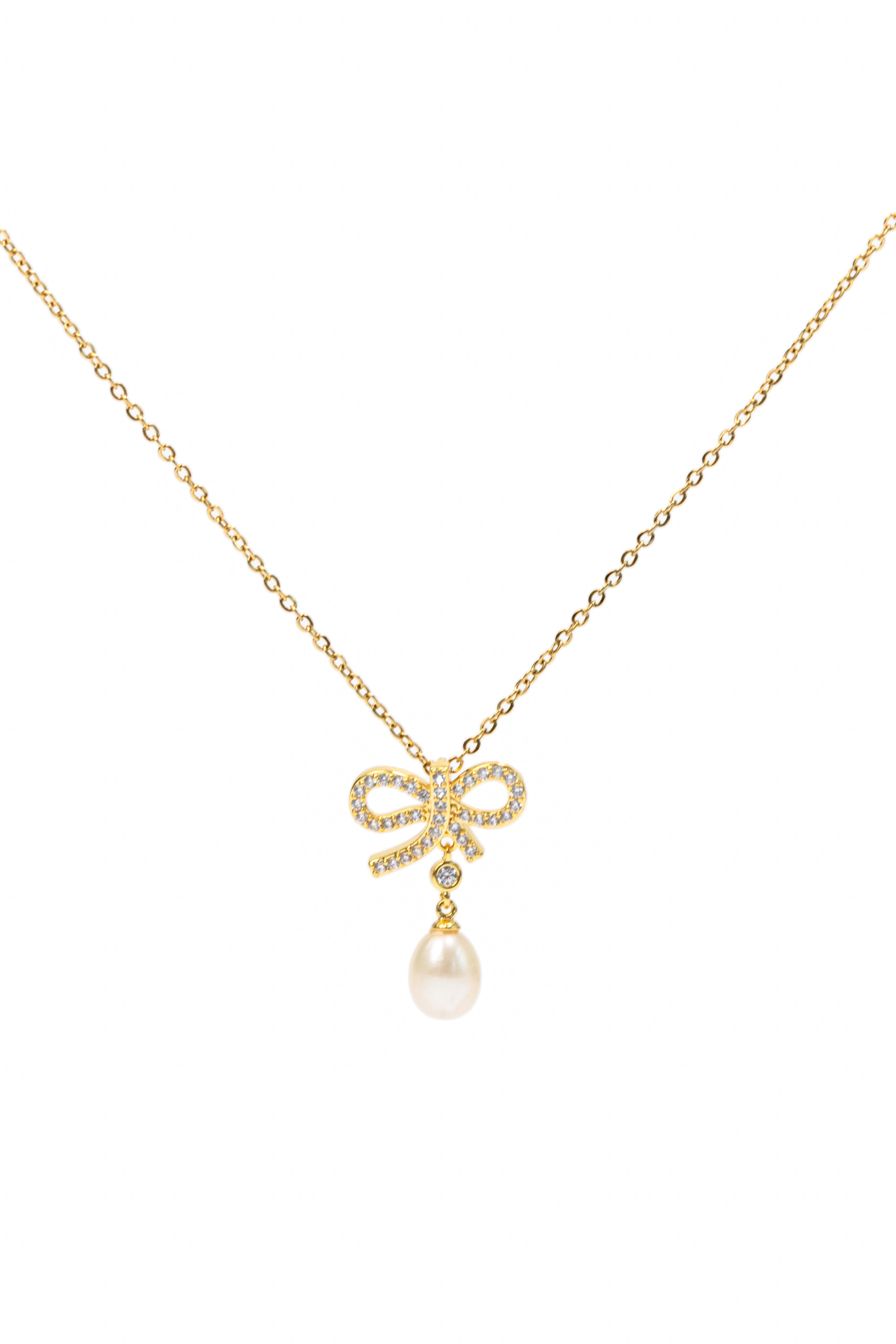 Beautify your look with this 18K Gold Bow Necklace with Freshwater Pearl. Crafted with a luxurious zircon bowknot pendant and a shimmering Freshwater Pearl. this stylish piece is perfect for elevating any look. Add a touch of class and sophistication to your wardrobe with this elegant necklace.