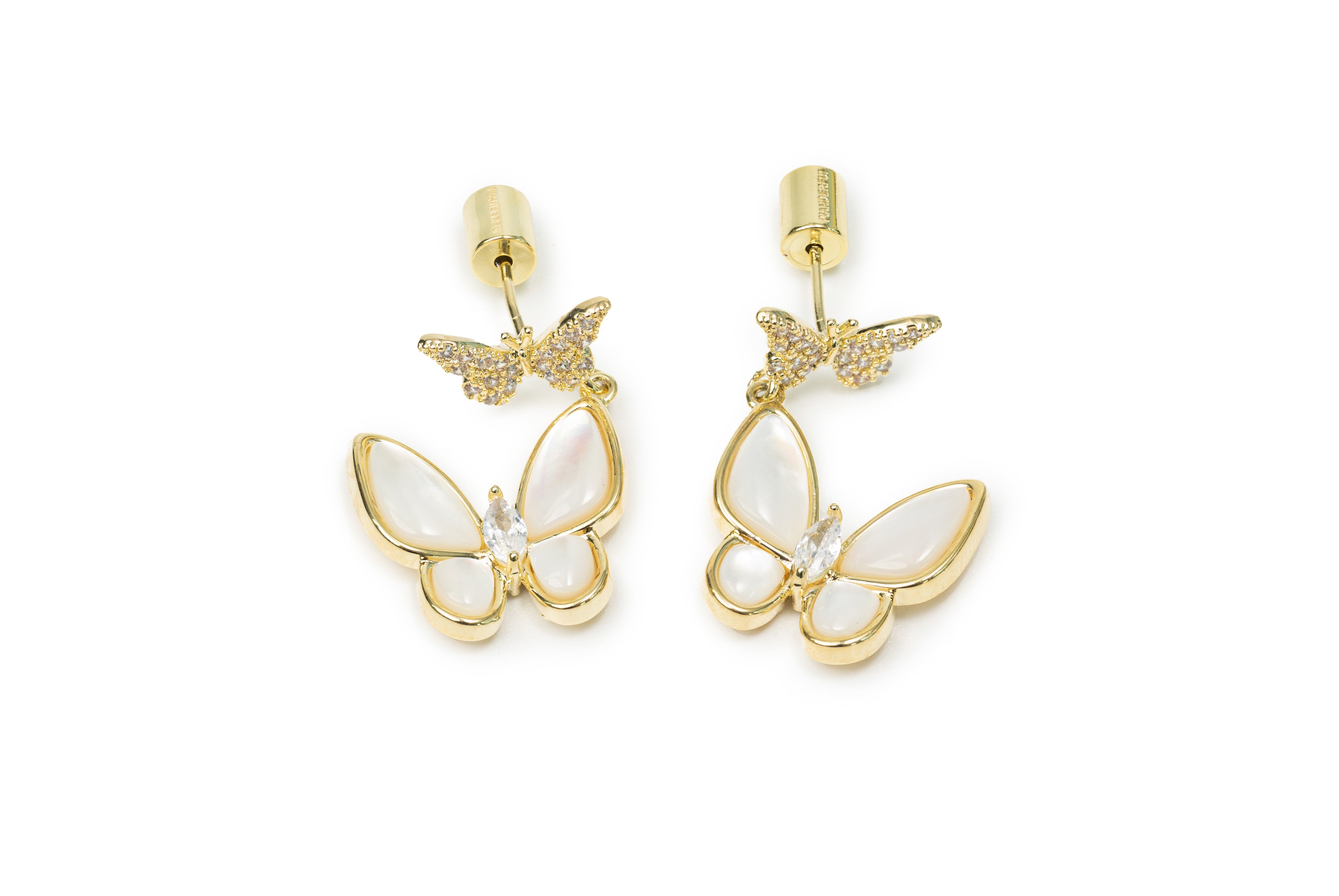 Crafted with graceful sophistication. these Butterfly in the Garden Drop Earrings radiate with a golden luster. Exquisitely adorned with dual butterfly designs. these ethereal earrings offer a tasteful. refined touch to every look. These dazzling earrings are the perfect way to add a hint of light and luxury to your wardrobe.