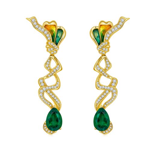 Elevate any outfit with this gorgeous Golden Silk Ribbon Enamel Drop Earrings. Feature with silk ribbon. this earrings boast a beautiful pear drop lab-created emerald stone for a stunning finish. It's an elegant addition to any outfit.