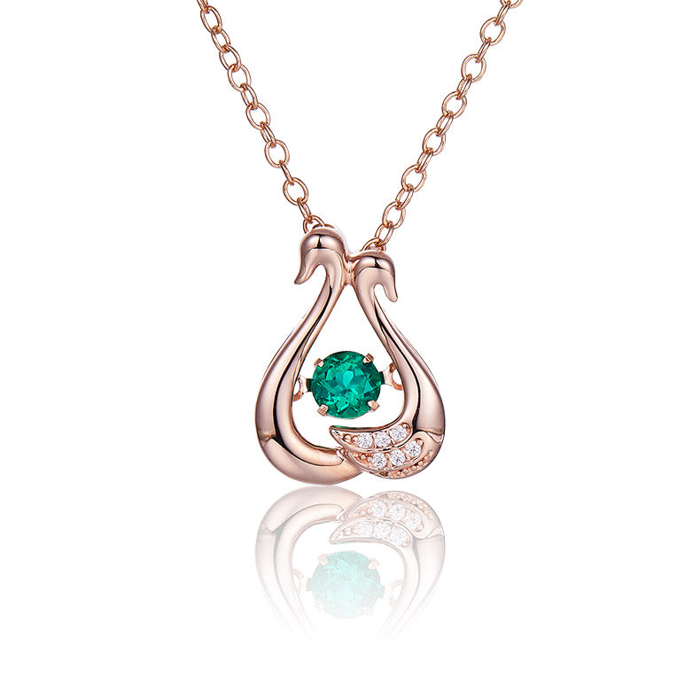 This Rose Gold Colour Little Swans with Round Green Zircon Necklace is a beautiful. timeless piece. Featuring a elegant Little Swans pendant decorate with a round Green Zircon in center. Crafted in sterling silver plated in rose gold. this necklace instantly elevates any look with its classic. sophisticated design.