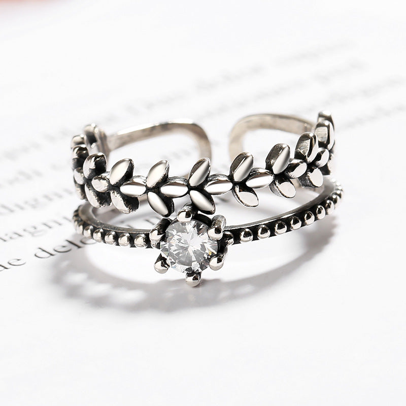 This Retro Leaves with Zircon Double-layer Silver Ring is a chic and stylish piece perfect for any occasion. With an opening double-layer design featuring vintage leaves and decorated with a dazzling round Zircon. this accessory is sure to dress up any outfit.