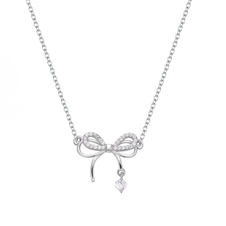 Enchanting and timeless. this Sweet Bowknot Zircon Silver Necklace features a charming bowknot pendant adorned with sparkling Zircons and suspend a small round Zircon. The attention to detail and choice of materials makes this a truly unique piece of jewelry.