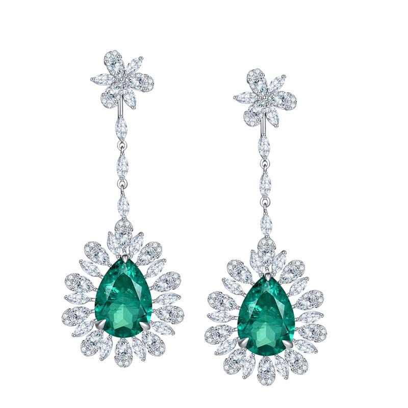 This Lab-Created Emerald 10*14mm Water Drop Ice Cut Annular Petals Silver Drop Earrings for Women have a classic sophisticated look. The water drop shape is adorned with Annular Petals. creating a perfect balance of elegance and sparkle. Crafted in sterling silver. this earrings is sure to make a lasting impression.