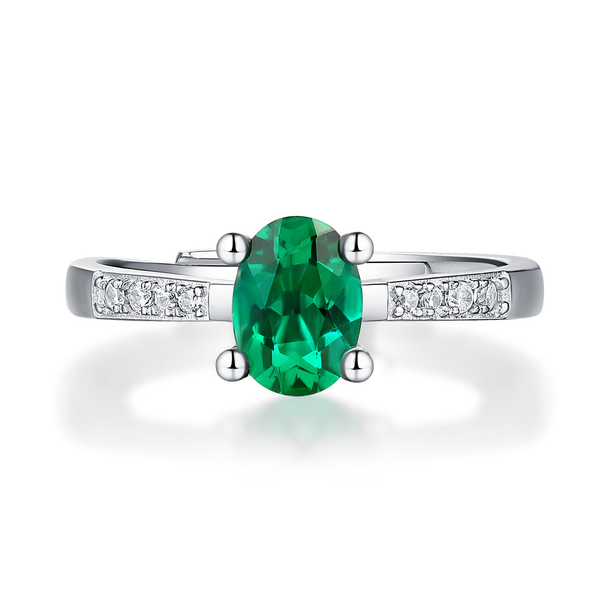 This stunning silver ring features a 1.0CT oval cut lab-created emerald stone. firmly secured by four prongs and enhanced by an adjustable open-ended design. Its unique setting makes this piece the perfect choice for any special occasion.