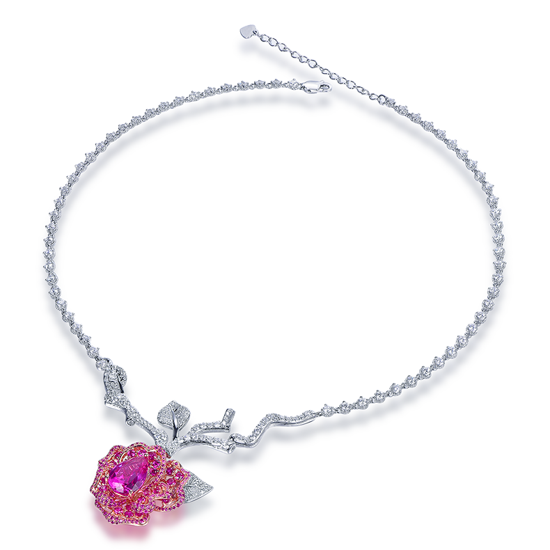 Enhance your elegance with the stunning Lab-Created Ruby Rose Pendant Moissanite Sterling Silver Necklace. Crafted with precision. this necklace embodies timeless sophistication and modern allure.