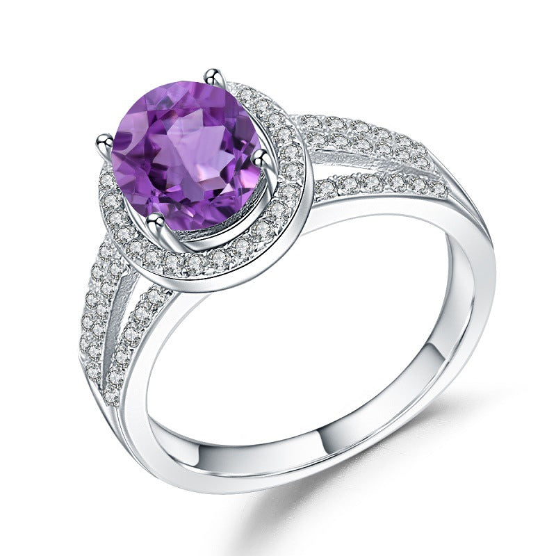 This beautiful Natural Amethyst Court Style Oval Soleste Halo Modern Split Shank Silver Ring for Women is the perfect way to add a touch of elegance to your wardrobe. Featuring a stunning oval Natural Amethyst with a Soleste Halo. complemented by a modern split shank arm decorated with small zircons for added shine and sparkle. Impressive quality and craftsmanship make this piece an outstanding choice.