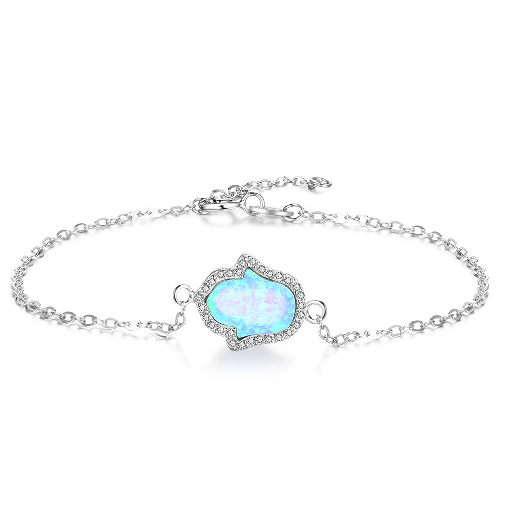 Experience the exclusivity of this luxurious sterling silver bracelet. featuring an eye-catching Palm shape Blue Opal with sparkling Zircon Soleste Halo. Crafted with expert precision. this exquisite piece showcases the delicate attention to detail and exquisite craftsmanship that defines our luxury.