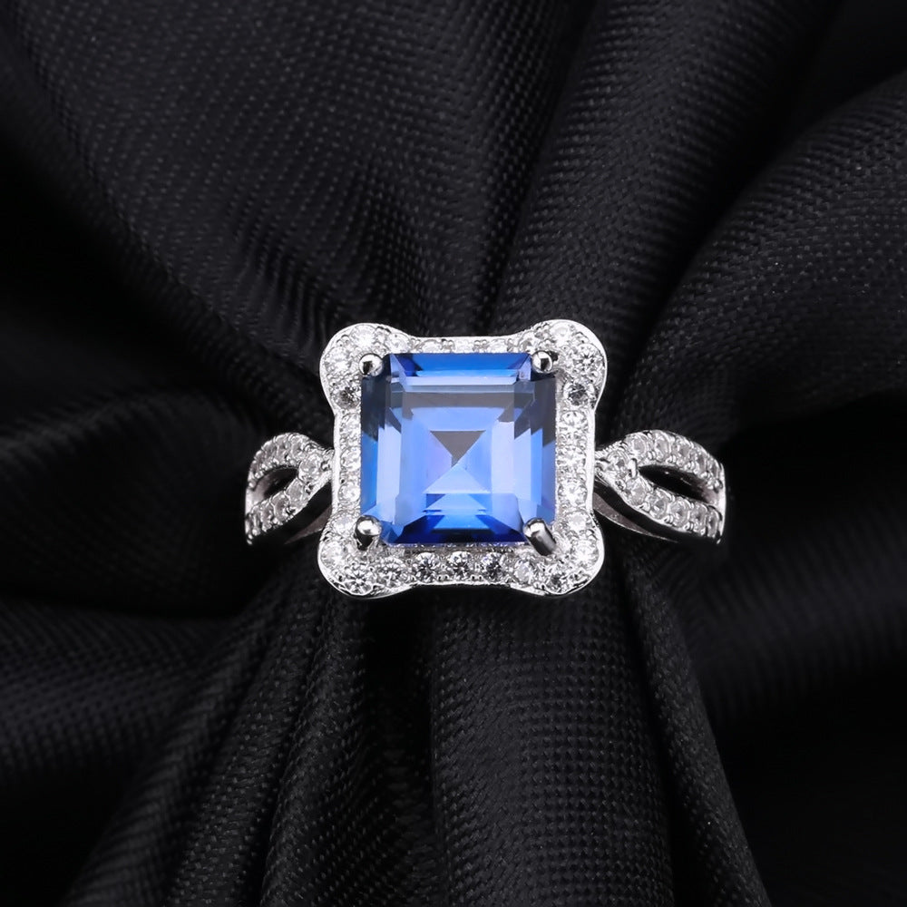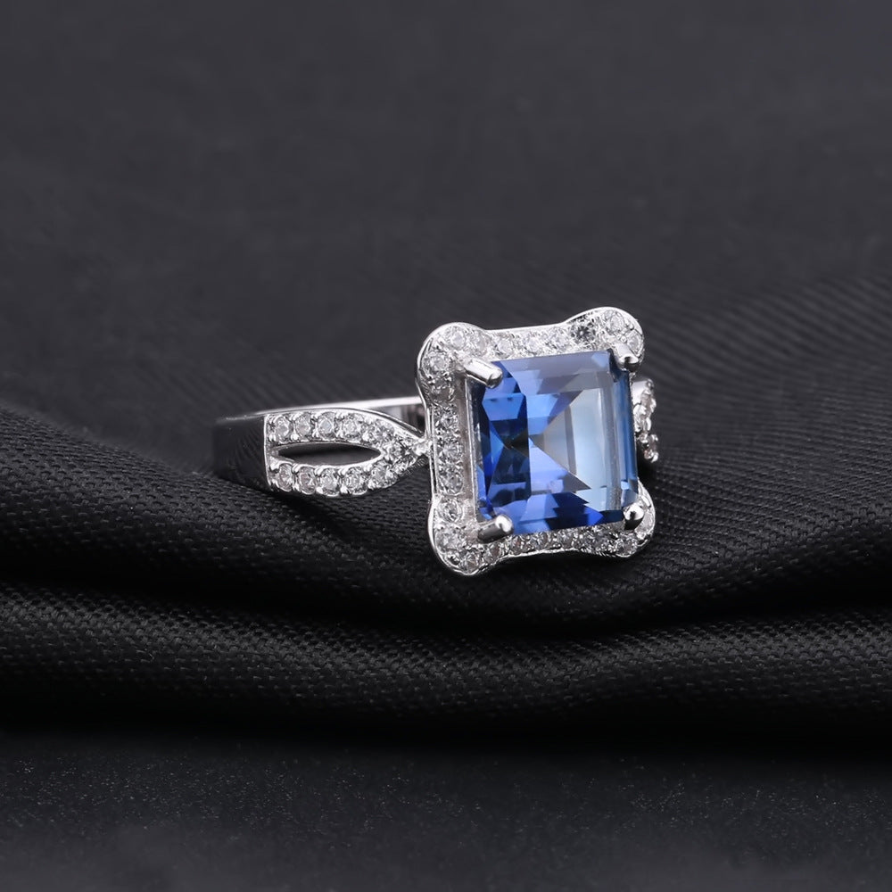 Transform any look with this elegant Square Soleste Halo Modern Split Shank Silver Ring. Crafted from sterling silver. this beautiful piece features a square blue crystal at its center. surrounded by a lush Soleste Halo. and a split shank ring arm uniquely decorated with small zircons for extra sparkle. Whether it's a special occasion or everyday glam. this stunning piece is the perfect choice.