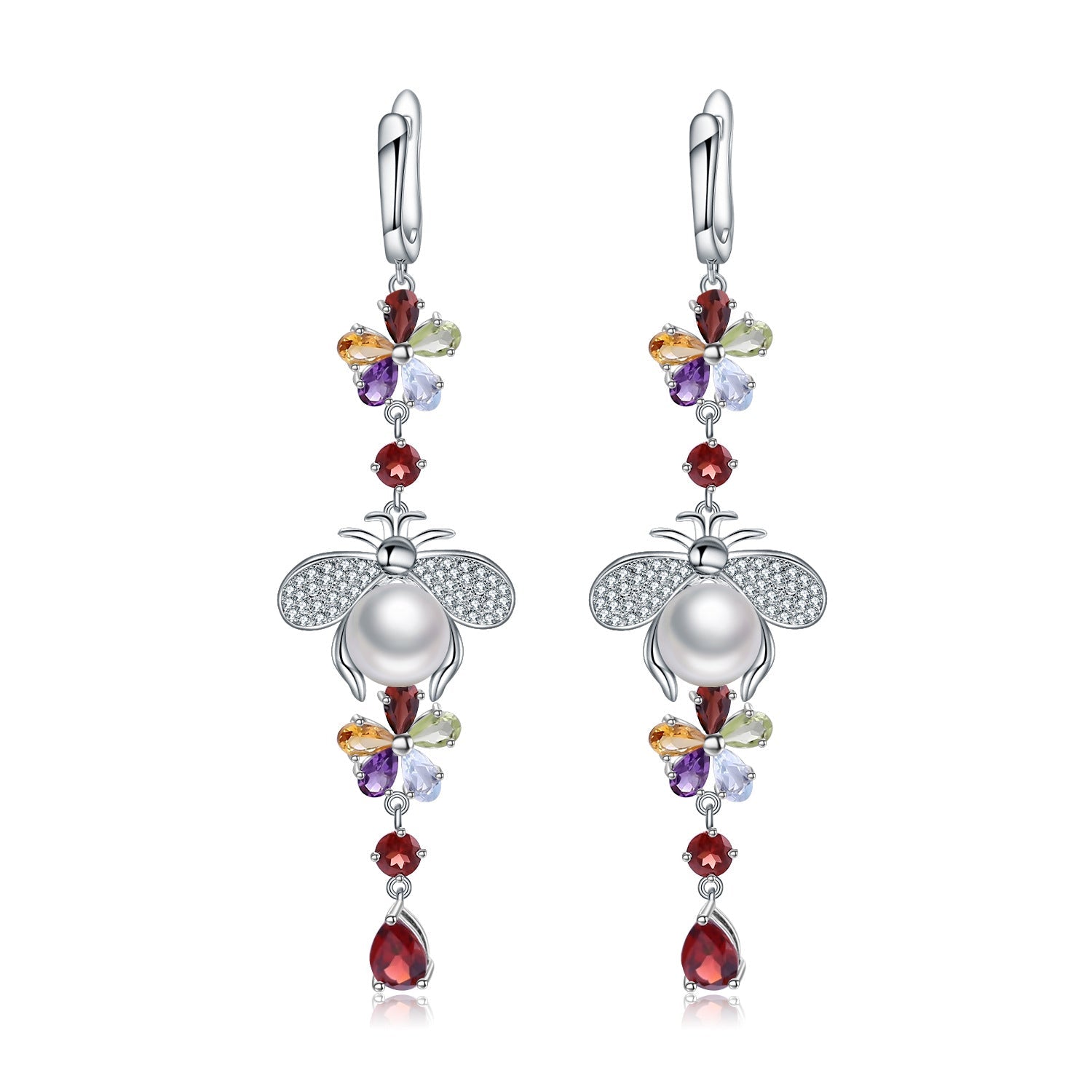 This European silver drop earrings for women feature a bee with pearl. and flower with colourful crystal design. Crafted from sterling silver. they make a stunning addition to any woman's jewellery collection.