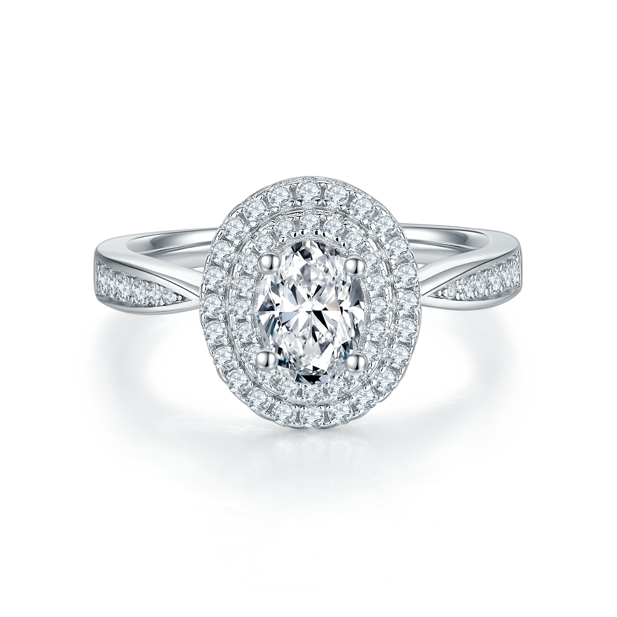 This ring uses the high quality 1.0 carat oval shape Moissanite stone. Multiple small Moissanite are inlaid on the ring and the unique double halo designmaking the entire ring more luxurious and sparkly. This Moissanite ring is not only suitable for gifts and engagement. but also for various occasions such as dinners. dances. weddings. etc. It can make you the focus of the crowd.