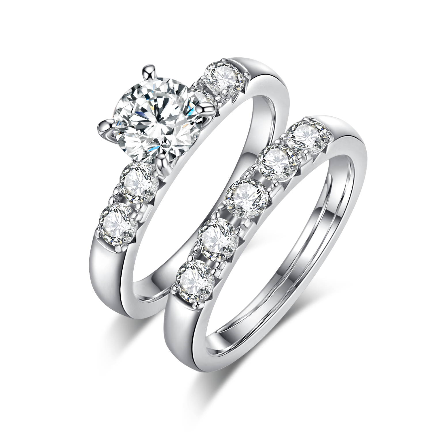 This Moissanite Five Stone Round Cut Band Rings Pack is crafted with quality and detail. Featuring one ring decorated with a row of five small Moissanite Stones. And the other one is featuing the centerpiece being a Round Cut Moissanite decorated with four small stones on the ring's band. This dazzling set offers brilliant sparkle and timeless elegance.