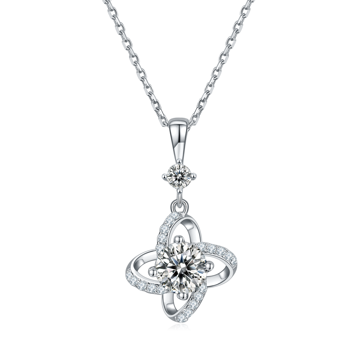 This necklace features a two round cut Moissanite stone in diffrent size. The pendant of the necklace is designed in the shape of windmill . This design element is often associated with good luck and fortune. making it an ideal gift for someone special or as a personal symbol of good luck. And the same time. multiple small Moissanite stones make the necklace more sparkly.