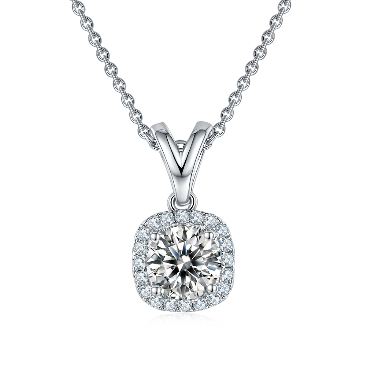 The round cut Moissanite is surrounded by a square Soleste halo setting. which consists of a series of smaller. round-cut Moissanite stones that encircle the central gemstone. creating an elegant and sophisticated look. And the necklace features a unique V-shape pendant buckle that adds a stylish touch to this beautiful necklace