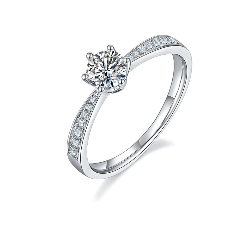 This exquisite band ring features a captivating 0.5-carat round-cut Moissanite stone that is meticulously set within the ring band with multiple small Moissanite. making the entire ring more sparkly.