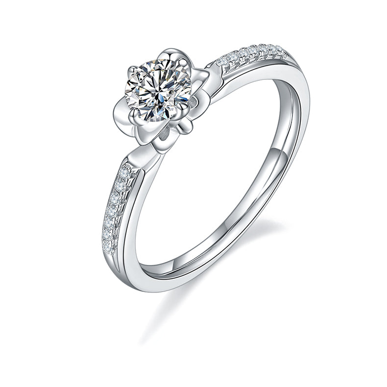 This ring uses a round cut 0.5-carat Moissanite . with high colour and purity. sparkly in any occasion. The luxurious flower petal four prongs design with small Moissanite is the characteristics of this ring. making it more gorgeous and elegance.