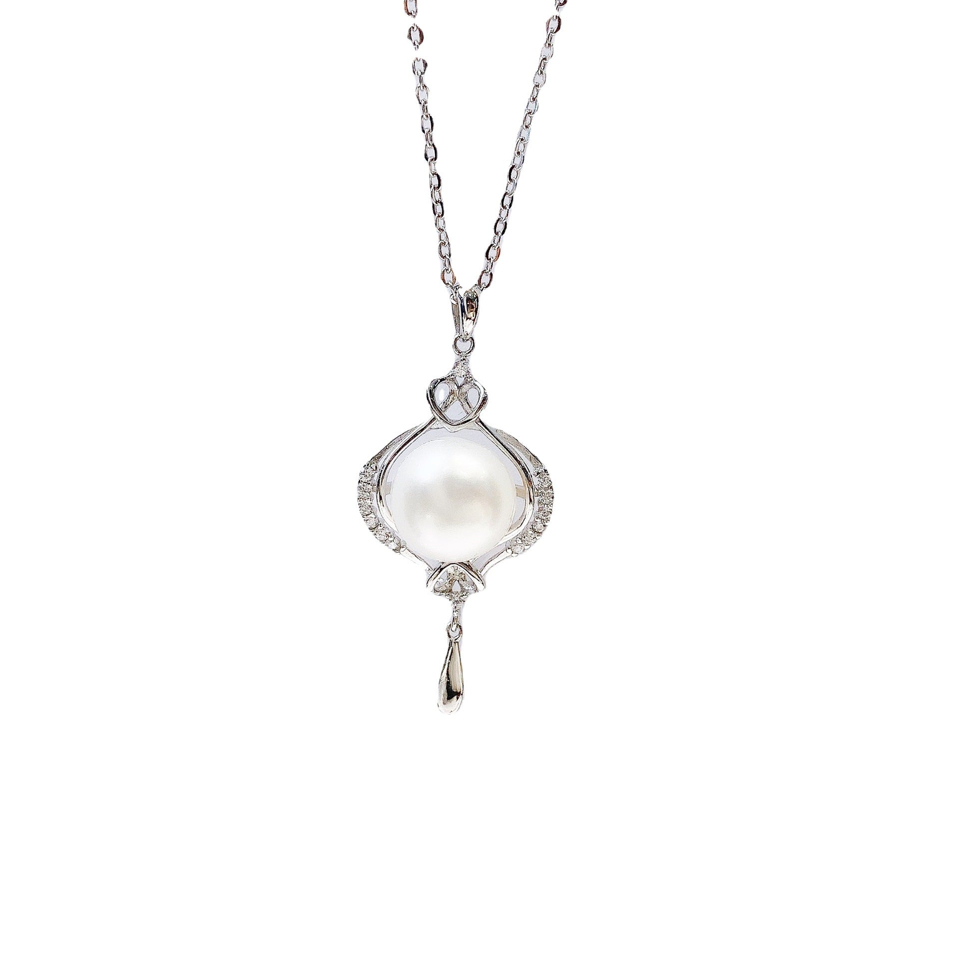 This exquisite necklace features a round natural pearl set within a lantern-shaped pendant. Feminine and graceful. this one-of-a-kind piece is sure to add a touch of sparkle to any outfit. Crafted in sterling silverto last. this stunning necklace adds timeless elegance to any collection.