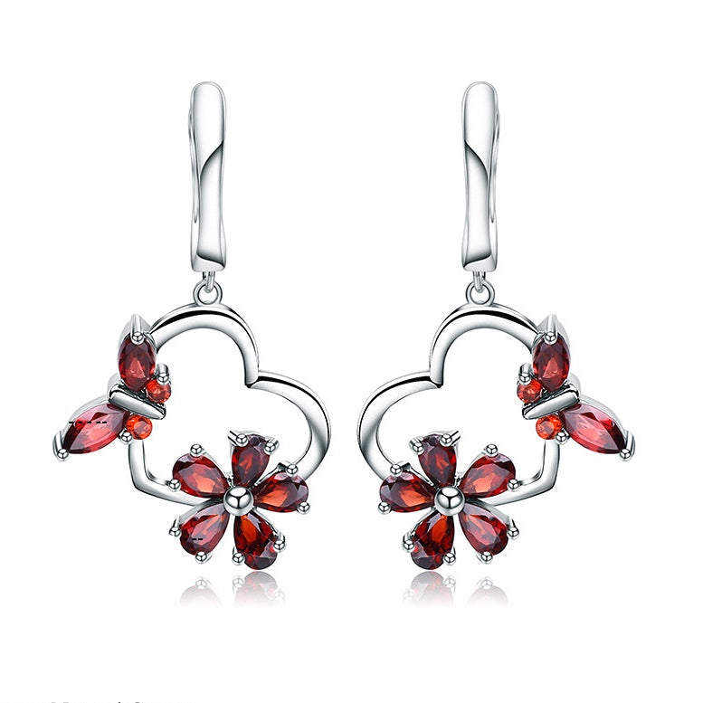 Elevate your ensemble with a touch of elegance with this Natural Garnet Heart Shape Silver Drop Earrings. Crafted with a hollow heart pendant and delicate Garnet Butterfly and Garnet Flower . they offer a luxurious and sophisticated look. It's perfect for day or night wear.