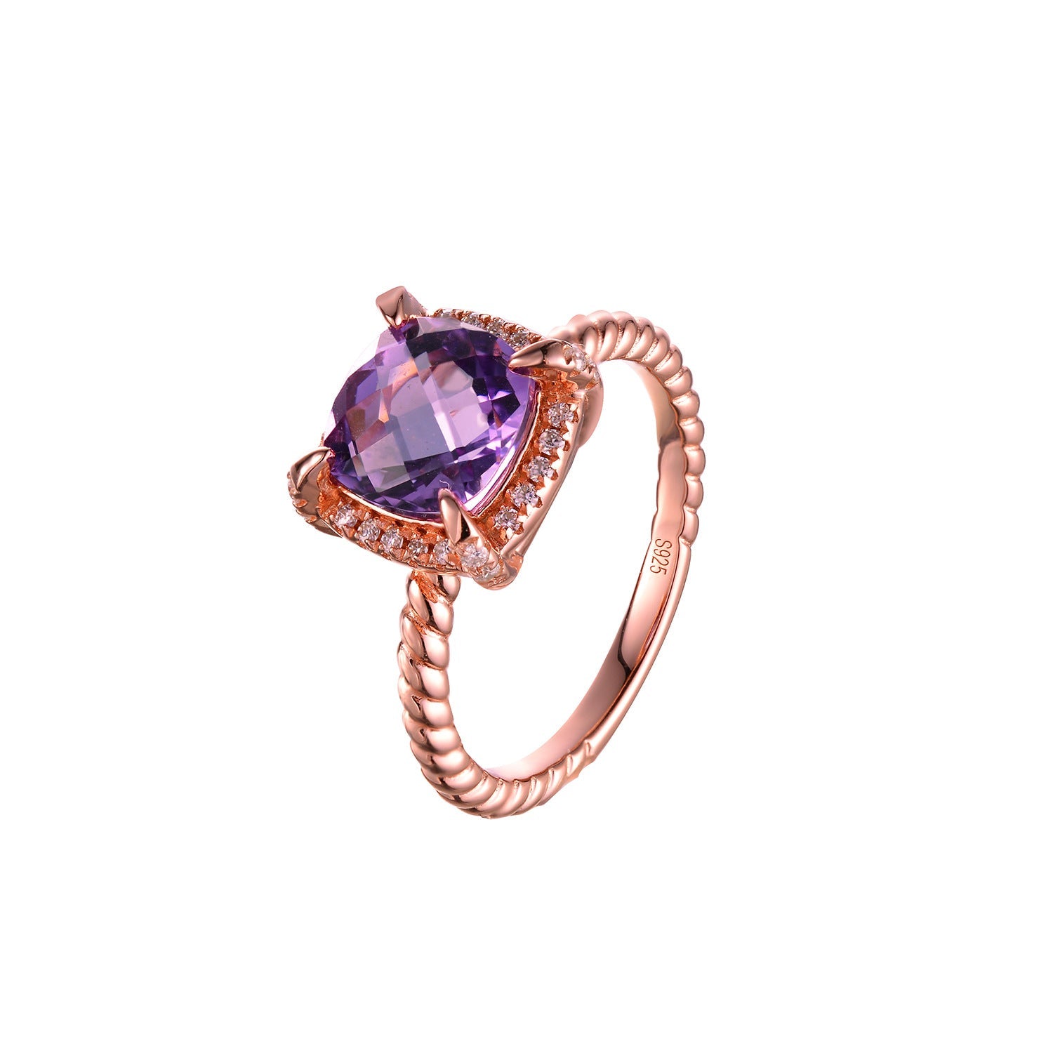 Delicate yet dazzling. this Soleste Halo Square Natural Amethyst Silver Ring sets you apart with its rare beauty. Crafted using a sterling silver base. this ring is plated in rose gold and features a captivating square natural amethyst stone that radiates with sophistication and charm. Slip on this unique piece for an exquisite look.