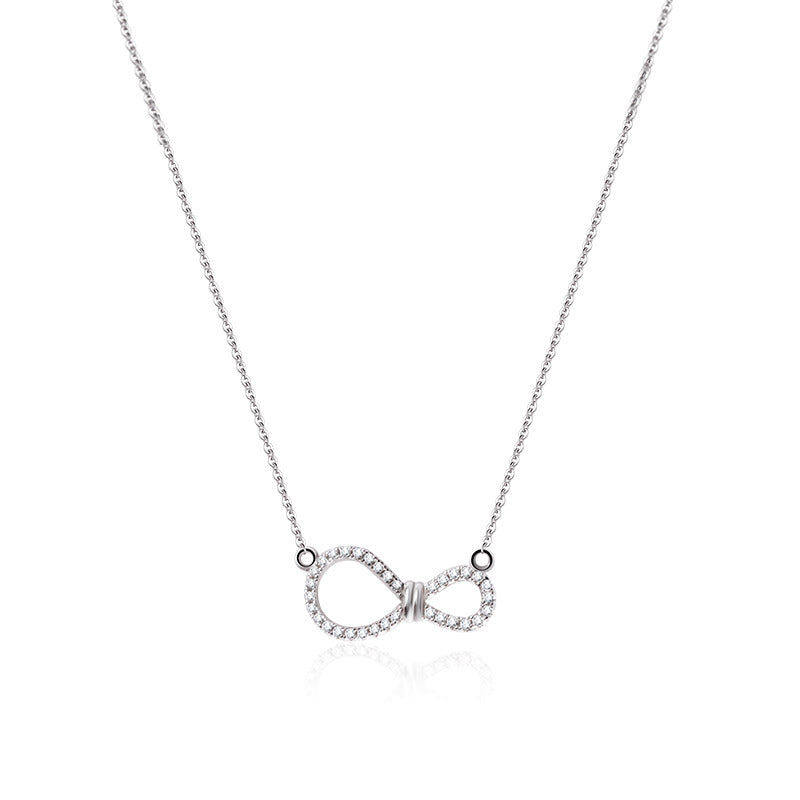 This necklace features a simple bowknot pendant like a infinite symbol that symbolizes infinite love. The pendant is embellished with micro-set zircon stones that add a sparkling and glamorous touch. The pendant has a hollow design that creates a light and airy effect. This necklace is a romantic and fashionable accessory that can express your love and style. You can wear it alone or layer it with other necklaces for a stacked and trendy look. This necklace is also a perfect gift for yourself or someone you love. as it can represent your bond and commitment.