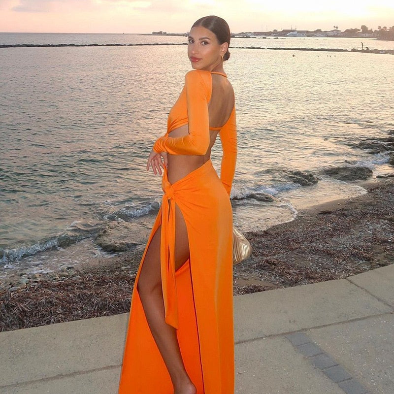 Orange Hollow Out Bodycon Maxi Dresses for Women Summer Sexy Twist Backless Slit Dress Long Sleeve Elegant Party Dress 2023