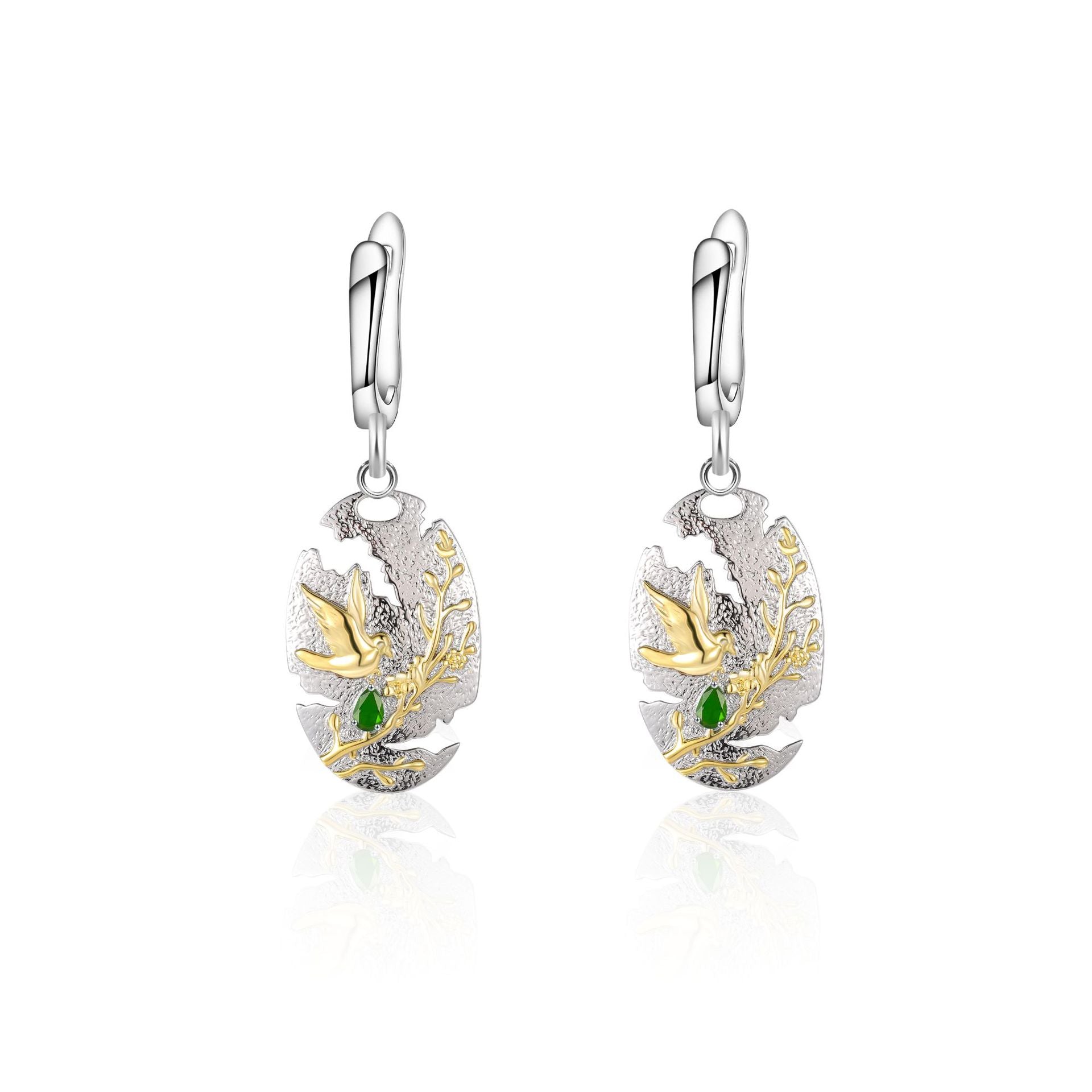This earrings is a unique and meaningful accessory. The main body of the earring is an oval shape with cracks design. with concave and convex frosted surface. and a pattern of bird flying in garden inside. symbolizing that although there is an imperfect side to life. it is also full of beauty and longing. There is also a crystal on the earrings as an ornament. Green crystal represents life and peace. and amethyst represents elegance and mystery.