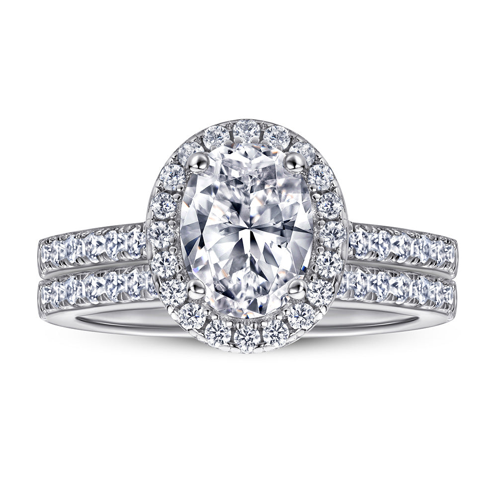 This striking two-piece set features an Oval Zircon Soleste Halo with Half Eternity Silver Ring. The oval-cut zircon is expertly set in a sparkly Soleste halo. creating a stunning effect. The half eternity ring band accentuates the design with sparkling stones that extend halfway around. Wear together for maximum impact or separately for two unique looks.