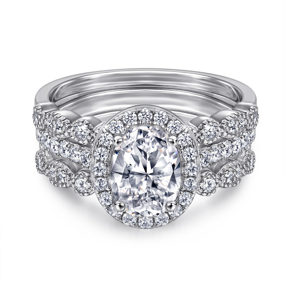 Look dazzling with this 3-piece ring set for women. Featuring an oval cut zircon with a Soleste halo and two half eternity rings decorated with small zircons. Multiple combinations wearing. it is perfect for special occasions or everyday wear. Expert craftsmanship and attention to detail shine through.