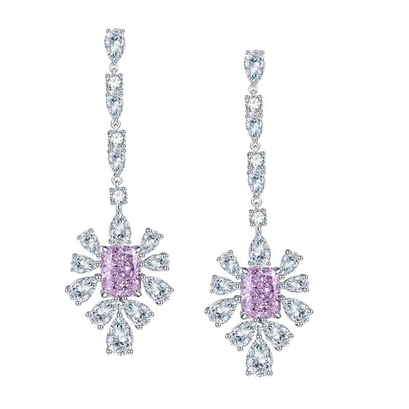 This extraordinary Pink Zircon 7*9mm Rectangle Ice Cut Drop Earrings feature a stunning tassel of zircon. with a rectangular pink zircon pendant. surrounded by zircon petals for a beautiful. one-of-a-kind design. Crafted with sterling silver. this earrings is sure to make a Luxury and Fashion statement.