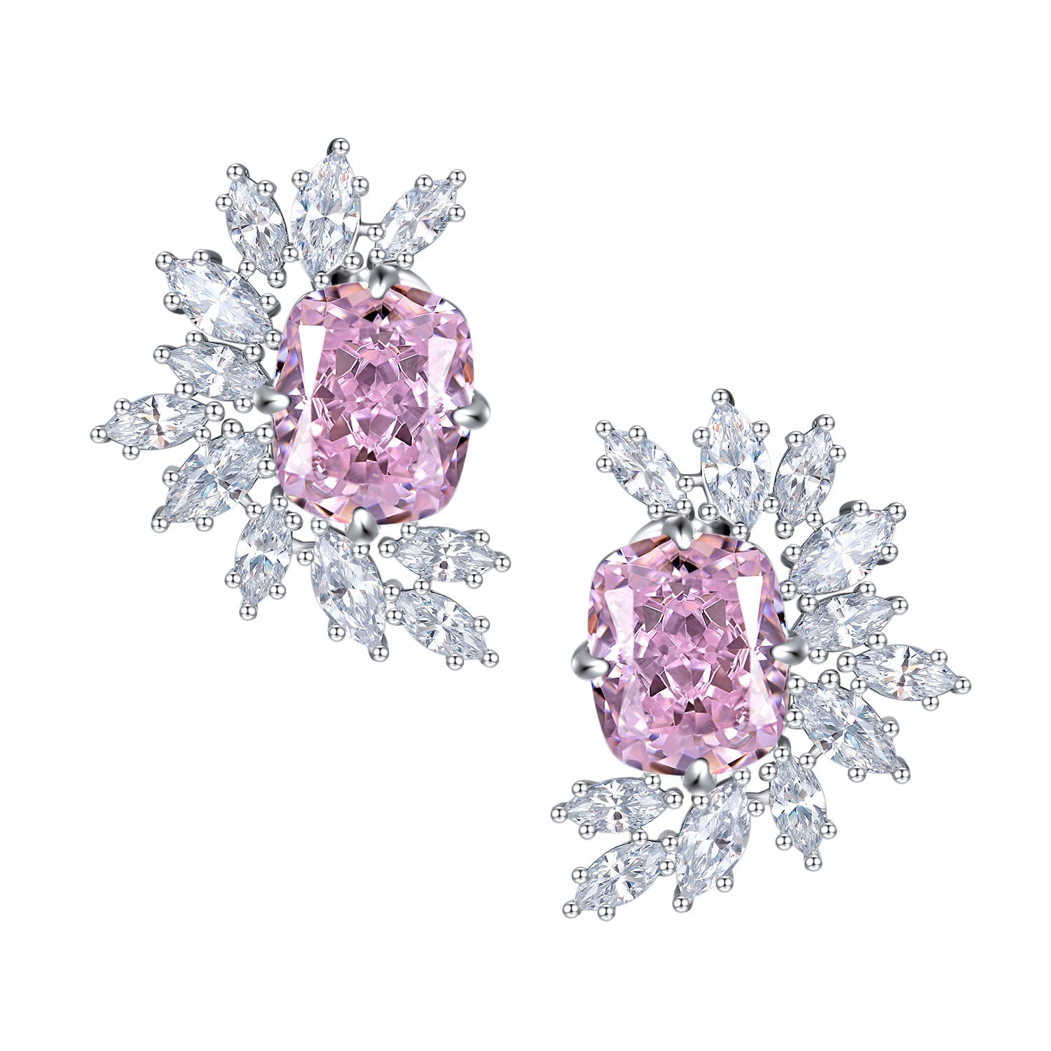 This studs earring features pink rectangular zircon as the main character. symbolizing stability and nobility. The design of the earrings is simple. with a half annular of horse eye shaped white zircon petals surrounding the zircon. resembling a half blooming flower. adding elegance and sweetness.