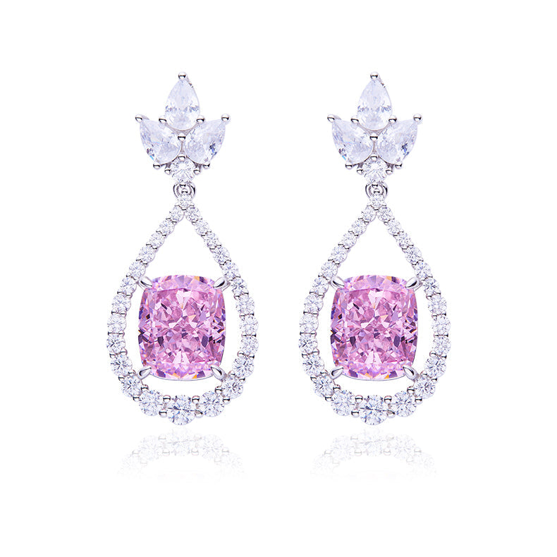 This stunning drop earring features a 12.7-carat pink rectangular zircon for a brilliant centerpiece. The design is further accentuated by white zircon decorations. creating a water droplet shape that radiates beauty. Pink zircon symbolizes love and romance. while white zircon signifies innocence and peace. Crafted from sterling silver. this durable piece can be comfortably worn all day long. Add subtle grandeur to your look and be the queen of elegance with this exquisite drop earring.