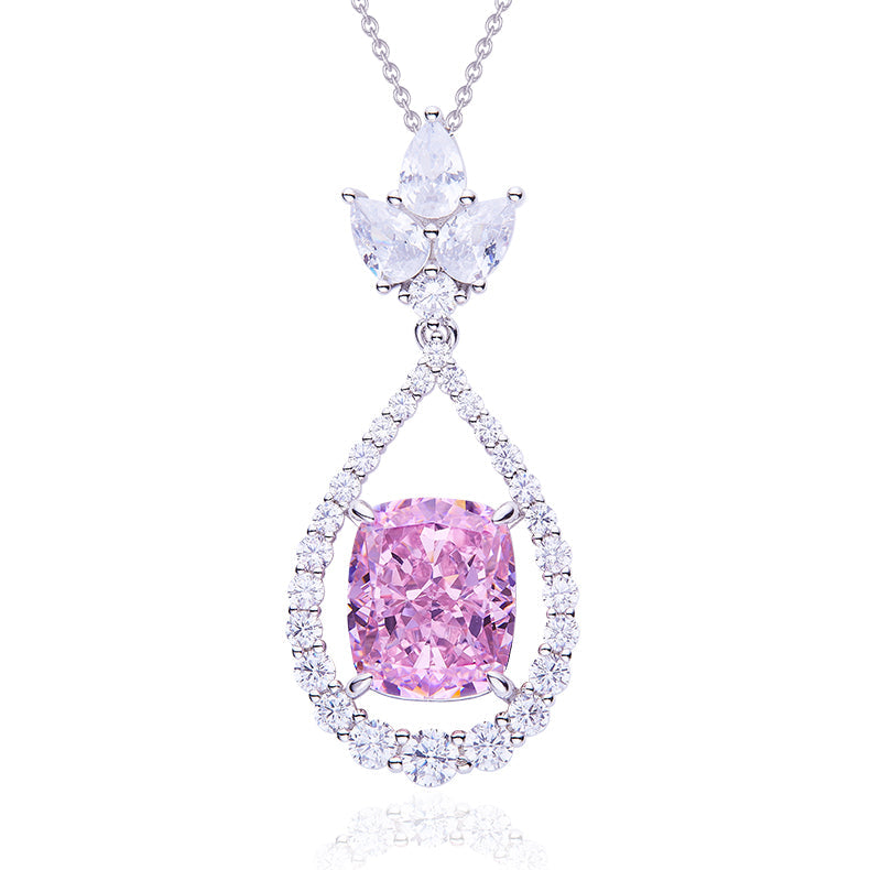 Add a touch of ethereal elegance to your look with this delicate cushion cut pink zircon water droplet necklace. Featuring a stunning 13.1 carat pink zircon. this necklace is sure to become your go-to piece for special occasions - a timeless classic that radiates sophistication and dreamy refinement.