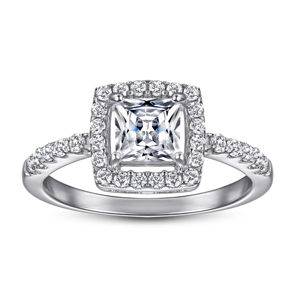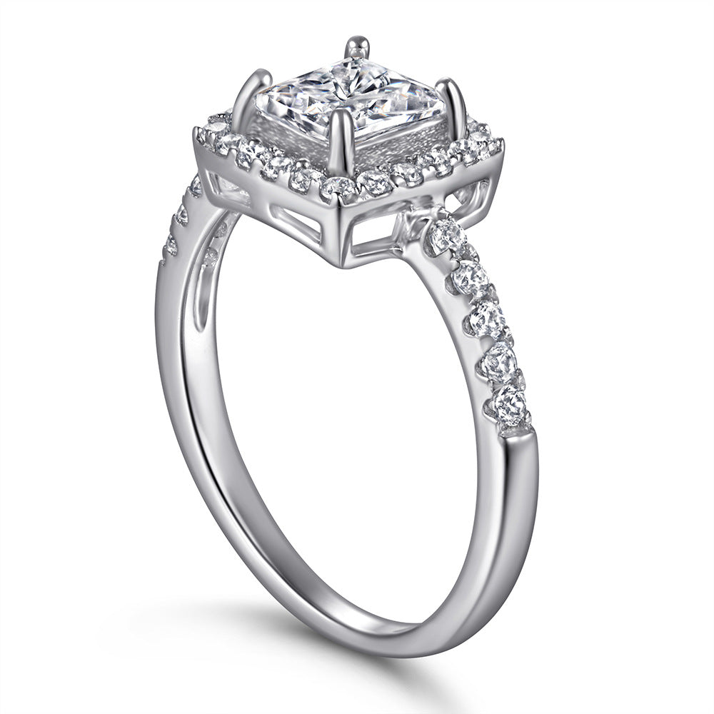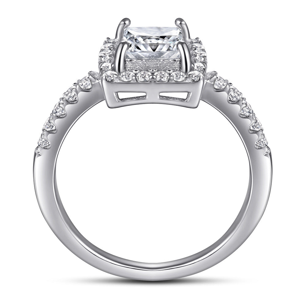 Experience the beauty of this Princess Cut Zircon Soleste Halo Silver Ring. The soleste halo sparkles with the princess cut zircon. and the ring arm is adorned with small zircons. creating an eye-catching design. The glamorous statement piece is perfect for any occasion.
