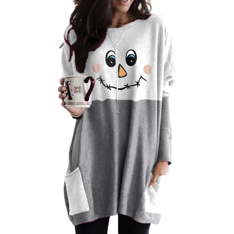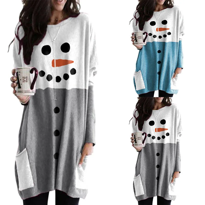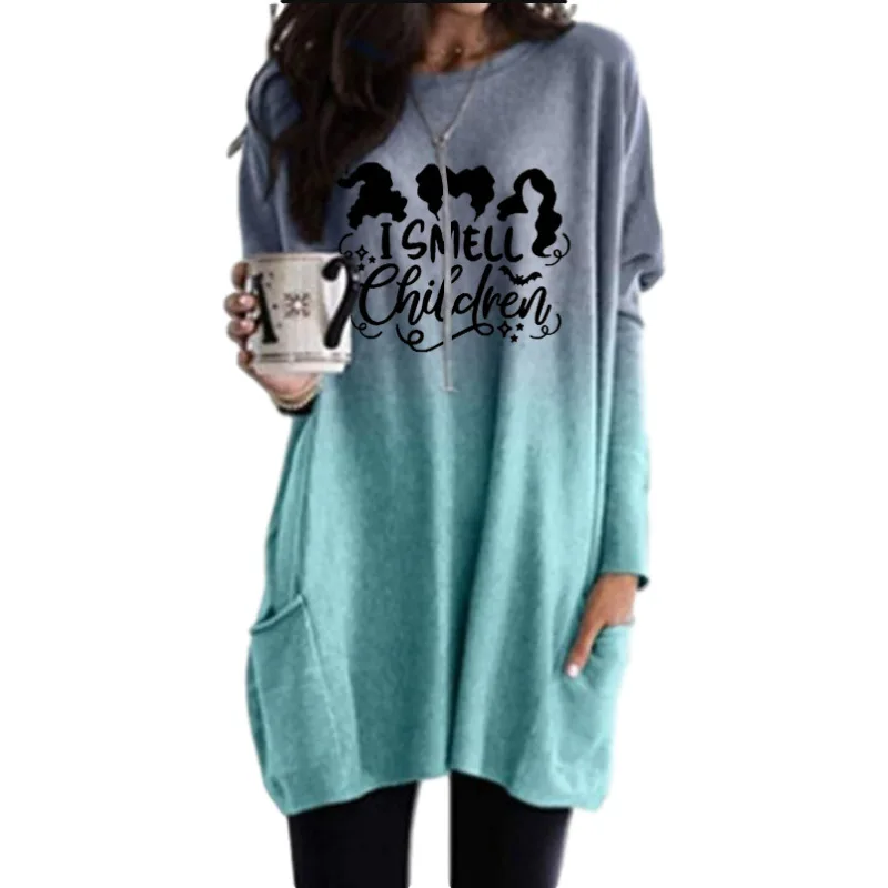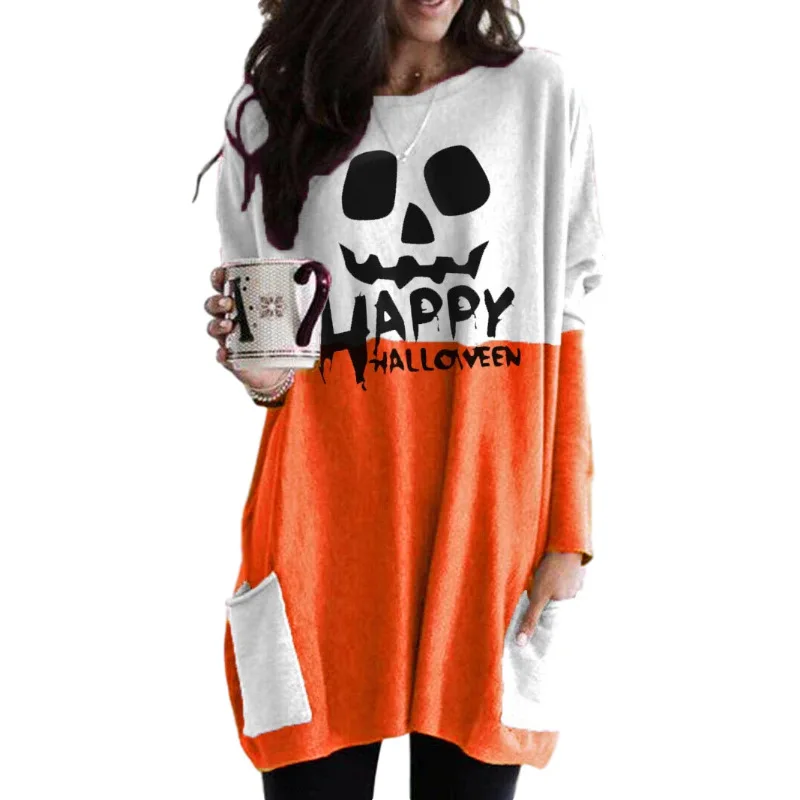 Print Dress Women Halloween Long Sleeve Round Neck Vintage Casual Knit Mini Dress Ladies Pocket Loose Dresses Vestido