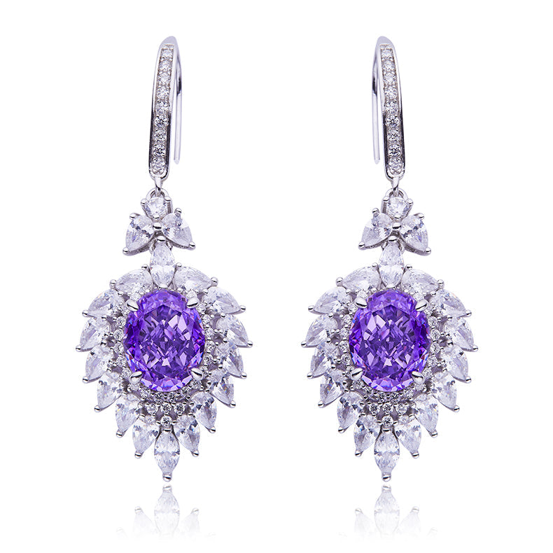 This drop earring is stylish and sophisticated. Crafted from sterling silver. the sturdy. long-lasting material ensures a lasting finish that won't discolour. Outlined with a 4.0ct oval-cut Purple Zircon. a bloom of white Zircons form a leaf-shaped halo. creating a graceful. eye-catching silhouette. Green Zircon emits a regal glow that adds mystery and nobility. while white Zircon radiates purity and elegance. Perfect for any occasion. this design adds a touch of glamour to your outfit and is sure to make you the centre of attention. Also ideal as a gift to your loved ones. it's the perfect way to show your appreciation and love.