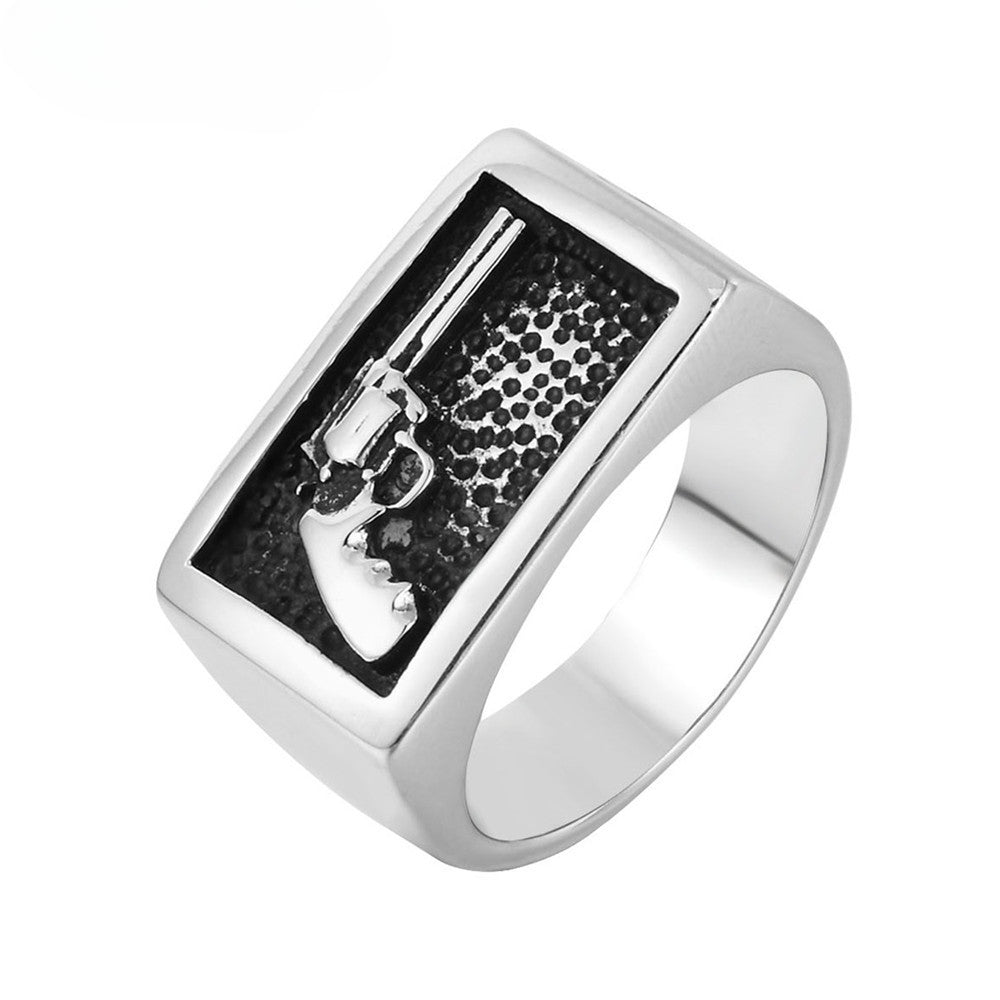 Step into the spotlight with our European and American personalized vintage jewelry pistol men's titanium steel ring. This punk gothic jewelry piece is designed to make a bold statement and elevate your everyday look to new heights.