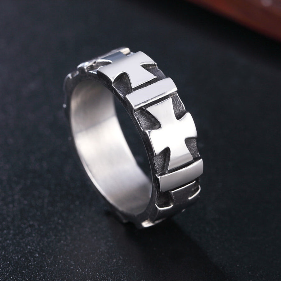 This vintage punk gear-shaped titanium steel ring features an eye-catching row of Teutonic Cross intricately detailed for an impressive finish. Crafted with state-of-the-art technology. it is an ideal choice for men looking to make a statement.
