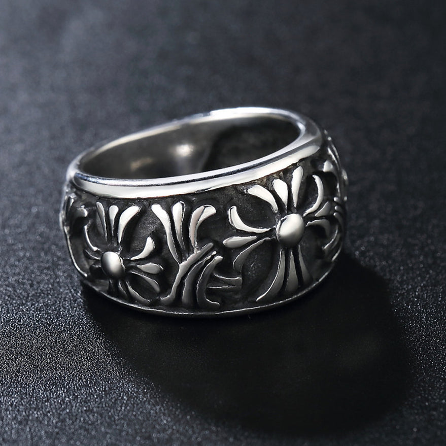 This vintage-style titanium steel ring features a Relief Cross Flower design. perfect for those looking to add rugged style and a touch of class to their finger. Crafted with durable titanium steel. this ring can withstand the test of time.