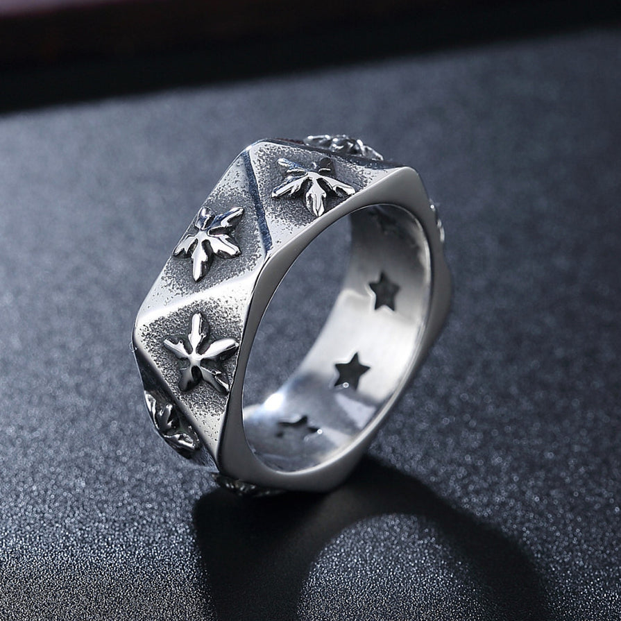 This Vintage Relief Snowflake Triangle Surface Titanium Steel Ring for Men is the perfect blend of style and sophistication. Crafted with a lightweight titanium steel. it features a sleek triangle surface and a unique relief snowflake design that adds a touch of elegance. Durable. stylish. and perfect for any occasion.